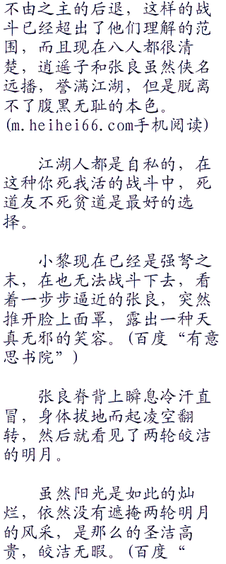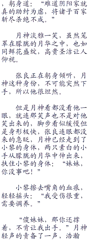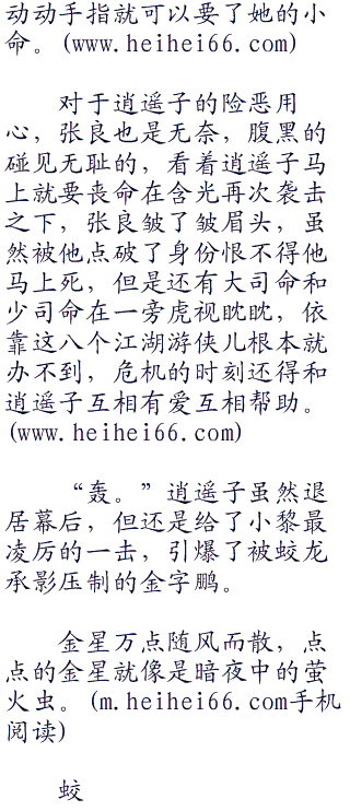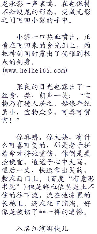 逍遥子匆忙之间闪身,孤鸿幻化成含光,从他脸颊上一划而过,逍遥子只感觉面门一疼,从额头到下巴,剖开了鼻梁,完美的一线。嫣红的鲜血流出来就像是一条蜿蜒的毒蛇,让逍遥子原本阴沉而英俊威武的面孔,多了七分狰狞三分可笑。