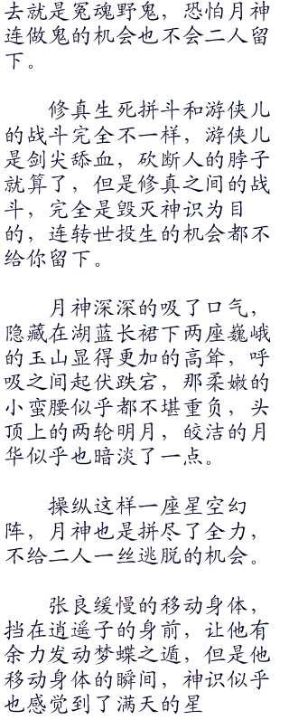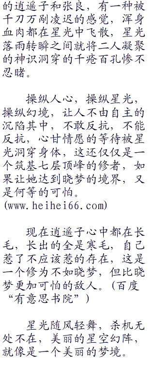陷入幻境之中的张良逍遥子,并没有看出月神如何发动攻击,但是瞬息之间就毛骨悚然,脊背上的冷汗之冒,仅仅是瞬间,神识无限的扩大,那点点飘落的星光,如同落雨一般的密集,点点星光充满了危险的气息,带着看不见的锋芒。