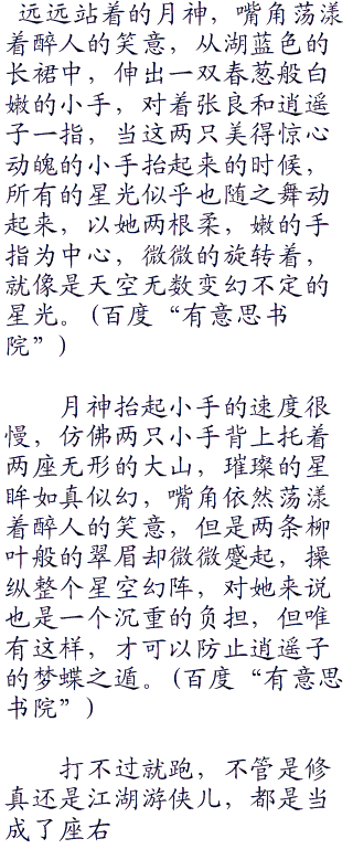 星云流转,巨大的威压从空而降,月神妖异的星眸中似乎也是星光闪烁,张良和逍遥子已经被皎洁的月光笼罩,四周鸦雀无声,神识观察之下,就能看见从月华中分离出无数的星光,幻境之中无数细微的光芒疾射而出,好像是调皮的精灵,向着二人漂浮而来。