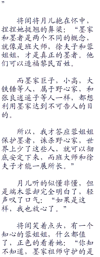端木蓉差点被他气笑了:“谁让你侠道王道不走,偏偏走入这条绝路。”