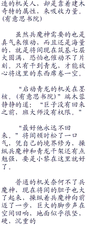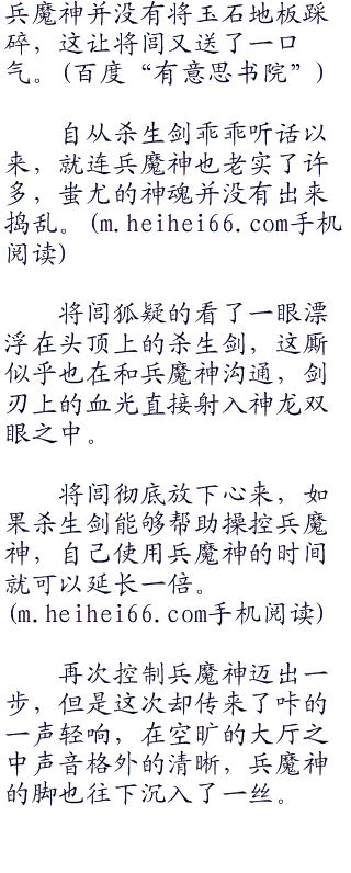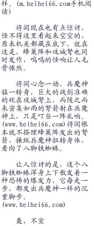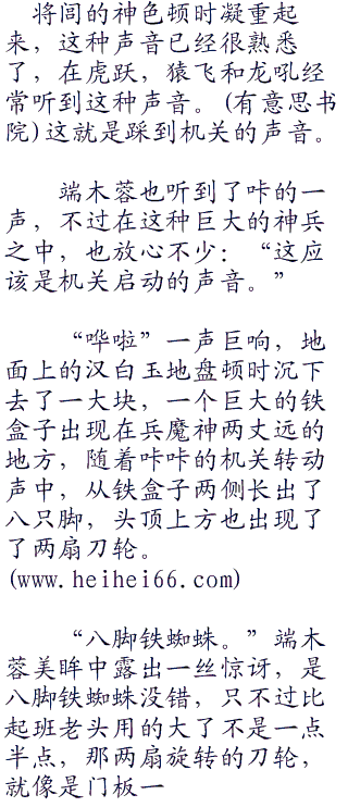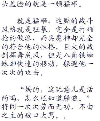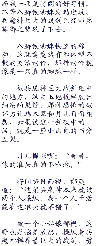 兵魔神是将闾最后的杀手锏,也是他敢闯进墨家密地的依仗,但是亮出了这个绝世神兵,却没见到墨家青龙,就像是倾尽全力的一拳打在空处。那种郁闷。