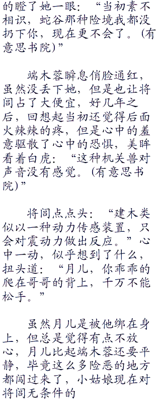 对于建木这玩意儿,将闾是真心的腻歪,端木蓉的轻功不高,但是身体也足够轻盈,落在地面尘土上,只是一个浅浅的脚印,结果就被这家伙发现了。