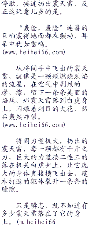 精妙机关术,简直是绝了。但唯一庆幸的是,这只机关白虎是瞎子,三人只要不动,它就不知道向那个方向攻击。