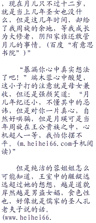 将闾强颜一笑;“月儿是阴阳家的礼魂,将来的圣女,必须是纯洁的处子之身,我就是胆子再大,也不敢破了她的身子。”