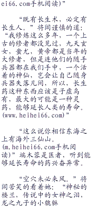 月儿稳定了一下心神,这才怔怔的道:“勃海之东,不知几亿万里,有大壑焉其中有三山焉,一曰方壶,二曰瀛洲,三曰蓬莱,盖尝有至者,诸仙人及不死之药在焉,其物禽兽尽白,而黄金白银为宫阙,望之如云。”