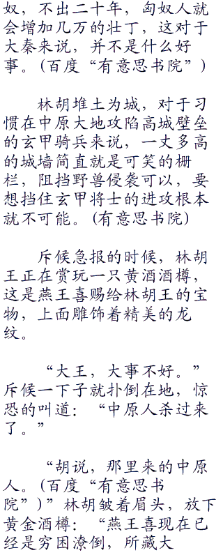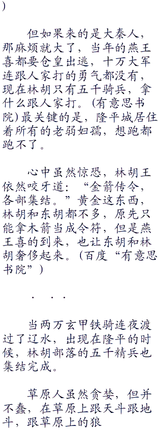 而对中原威胁最大的不是燕王喜的东燕,而是林胡和东胡,辽水北岸就是林胡的营地。逐水草而居是草原人的习性,不仅人类,就连放牧的牲畜也离不开水源,所以白凤每天的任务,就是顺着辽水上空飞行。