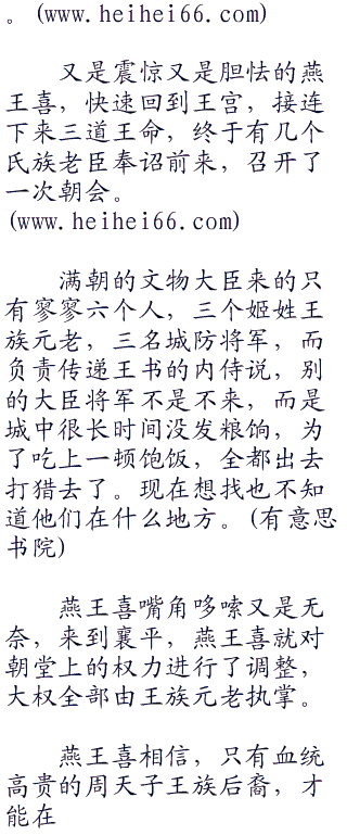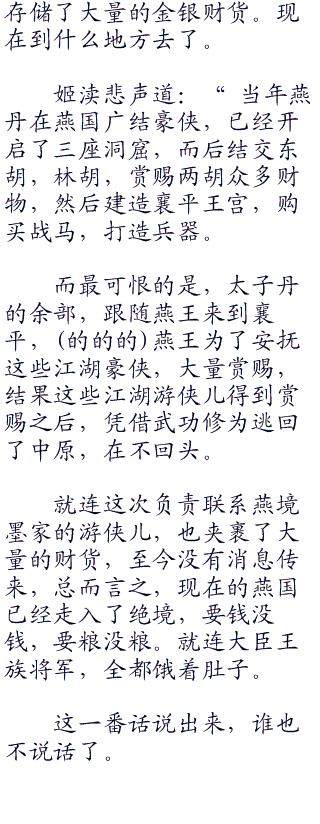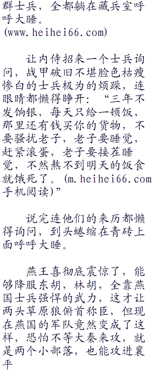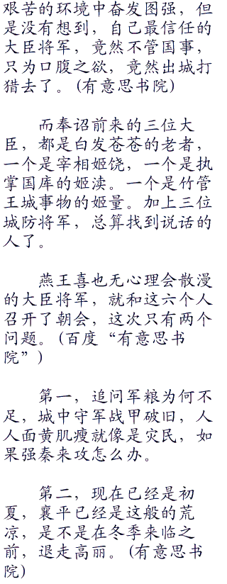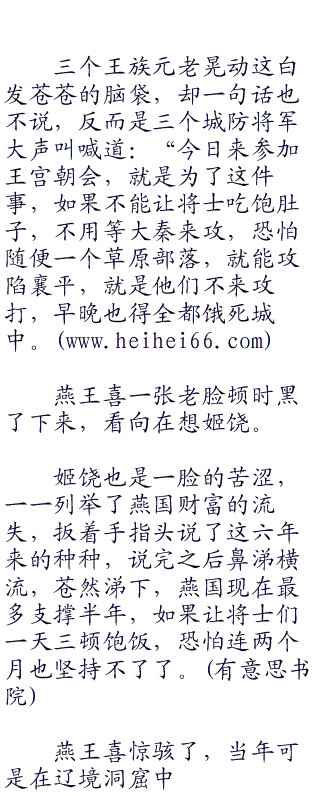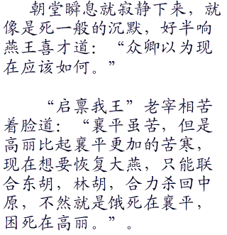 困局在襄平民房般的王宫,地域狭小不说,连个说话的人都没有,十几个嫔妃几个内侍,看见他们都嫌烦,林胡和东胡送来的胡女倒是不错,可是现在的燕王喜已经是白头老人,想要折腾也有心无力,最多动动手指过过干瘾,想要谋划复国大事,朝臣一个都不来王宫。