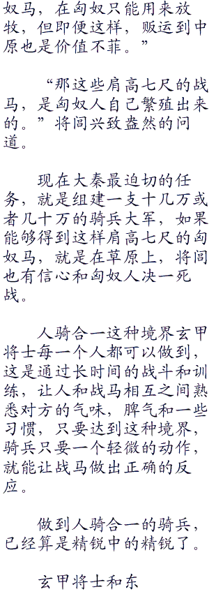 但是战果却截然不同,绝对不能将这支万人骑兵全部歼灭,换句话说,如果东胡骑兵一旦战场失利,转身就跑,大秦马绝对追不上匈奴马。