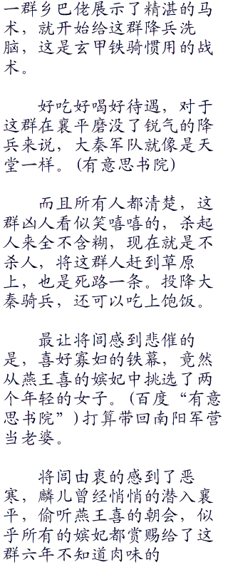 这句话竟然如同军令,燕国将士大声高呼一声万岁,立刻将手中的兵器扔在地上,在一队大秦铁骑的带领下,奔赴十里开外扎营。