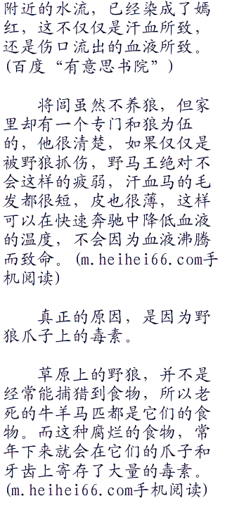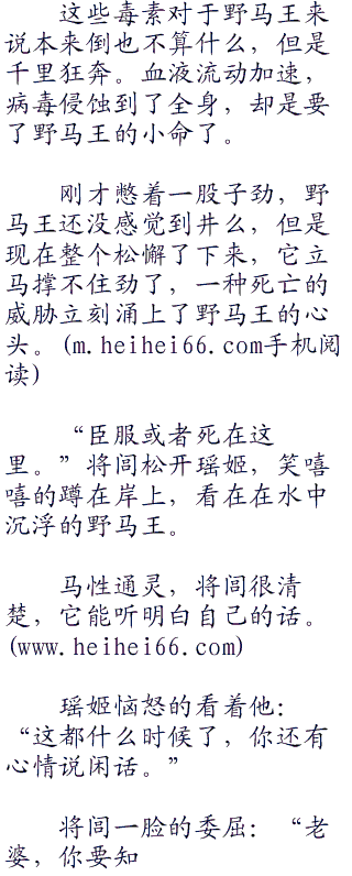 但是傲娇的野马王随着血液在身体中不断的流转,汗如雨下,被野狼抓伤的毒素也开始发作,前面已经是清澈的辽水,疾驰到辽水岸边,突然之间身体一晃,收住了马蹄,庞大的身躯噗通一声栽倒在水中。