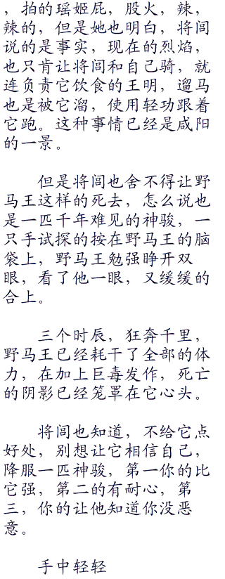 将闾搂着瑶姬的小蛮腰,慢慢的走进野马王,刚才的神骏和现在的衰弱,形成了极大的反差。