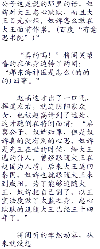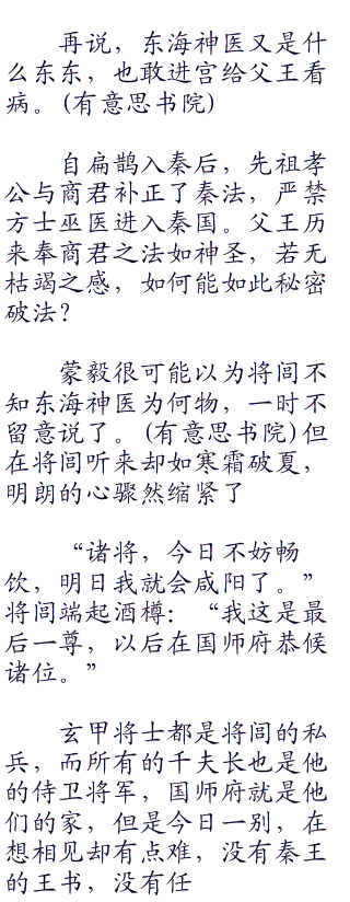 蒙毅笑道:“秦王身体虽然有小恙,但是赵高请了一个东海神医入宫,现在已经没事了。”