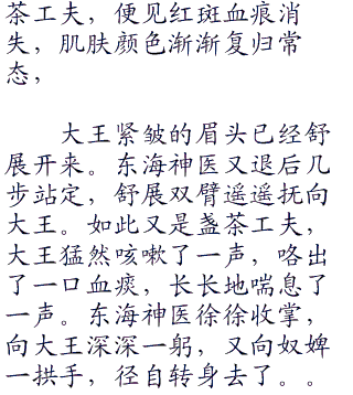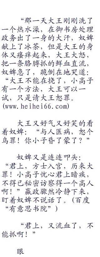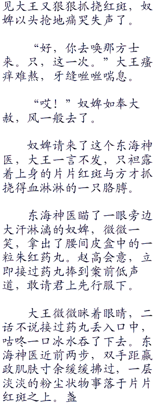 虽然有公子献给大王的交梨火枣滋补身体,但是这种疾病依然在缓慢的发作,而秦王却没任何的觉察,只是到了春夏交替,就会长处血斑,而这种血斑奇痒无比,但是却不能挠破,不然就真的麻烦了。”