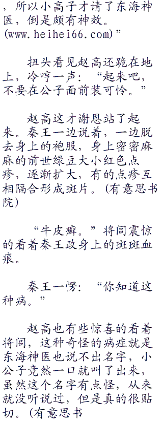 将闾伸手就把他拽了起来,笑道:“父王,不要责怪这个老货,东海神医的事,是蒙毅无意中透漏的,不干这个老货的事儿,不过这个老货竟敢瞒着我,也是该打。”