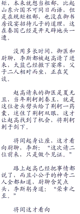 将闾不满的瞪了赵高一眼:“父王平常就吃这些,我在军中吃的都比父王好。”
