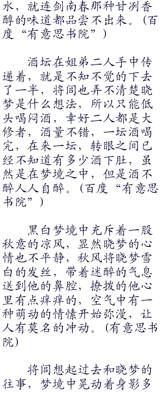 唯一出去的方法,就是修为比晓梦高,才能用功力强行冲开她的黑白梦境,但是想想晓梦的修为境界,算了,还是洗洗睡吧!