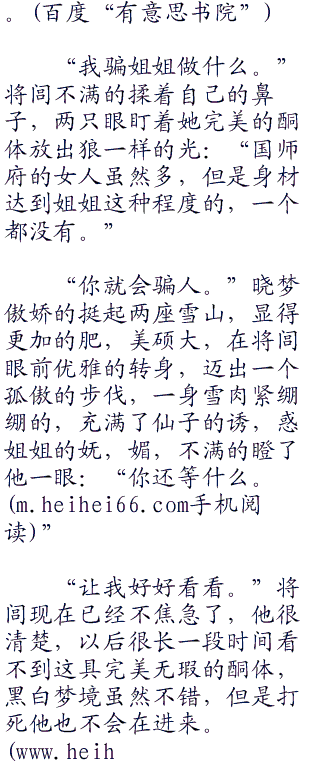 晓梦的身材修长,比起身高八尺的将闾不在以下,而且身材的比例非常的完美,玲珑浮凸,纤细的小蛮腰下那肥嘟嘟,滚圆的雪白的丰臀,展现出一种惊心动魄的美丽,肌肤非常的光滑细腻,白皙如玉,那是一种欺霜赛雪的白。