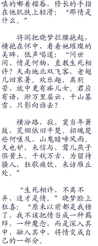 将闾一句只羡鸳鸯不羡仙,已经让她心中情丝萌动,而将闾最后的保证,也让她知道了什么叫男人的呵护。