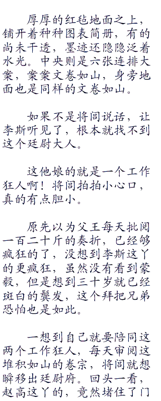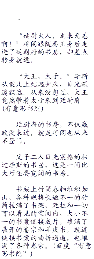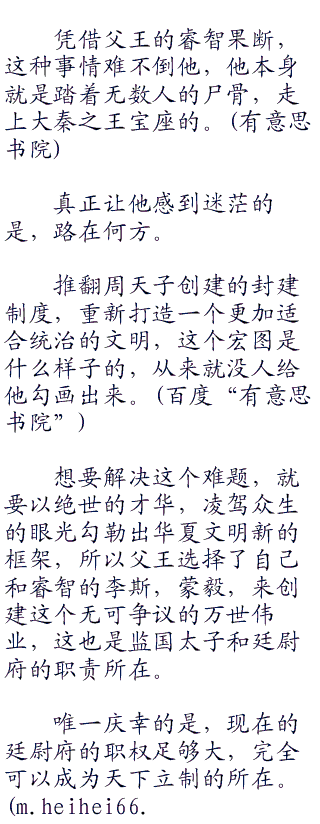 廷尉府的重要性已经不言而喻,自己加冠礼成,父王就迫不及待的将自己带到廷尉府,其目的已经昭然若揭,现在大秦的历史路程走到了一个转折点,而这个转折点却让父王和一群能臣干吏感到了迷茫。借用唐僧的那句话,就是敢问路在何方。