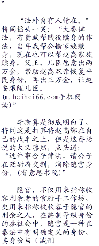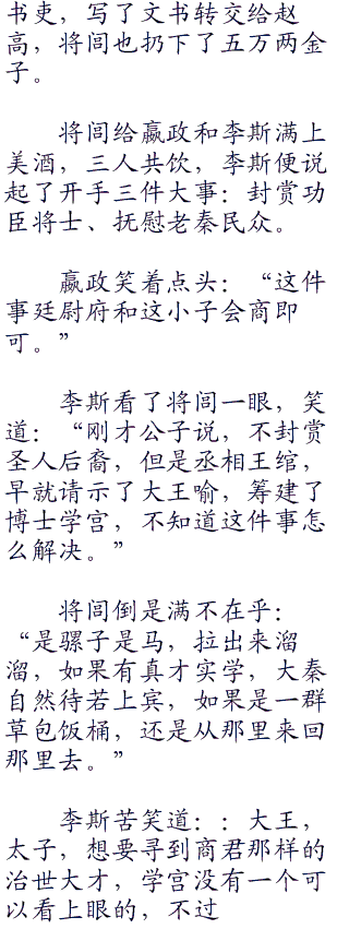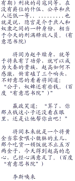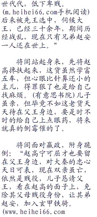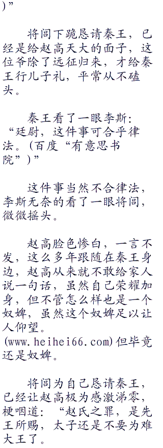 将闾认真的看着秦王道:“父王,赵高之才,不亚于廷尉,窝在宫中实在太委屈了,儿子斗胆,为赵高请命,放他出来做官吧!”