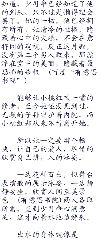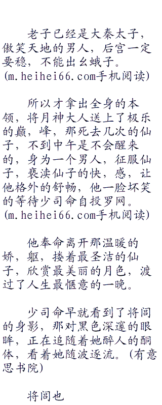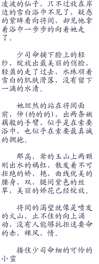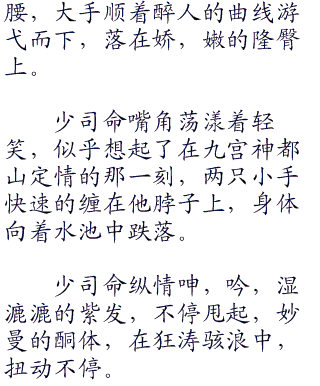 月神怯怯的道:“你还是别回来了,不然你又要,我明天就起不了身了,还不被姐妹们笑话死,小坏蛋别口是心非,少司命想你很久了。”