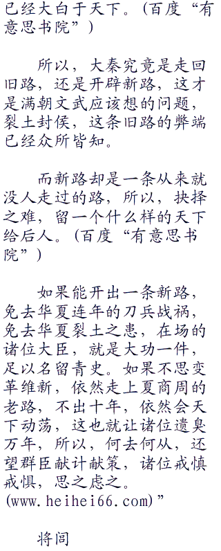 将闾扫了众臣一眼,声音瞬息就高亢起来:“一月之前,齐国不战而降,天下已经是大秦的天下,华夏在谱新章,但是大秦究竟是走那一条路,目前朝堂之上还没有决议。