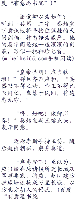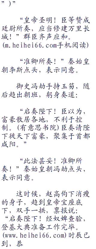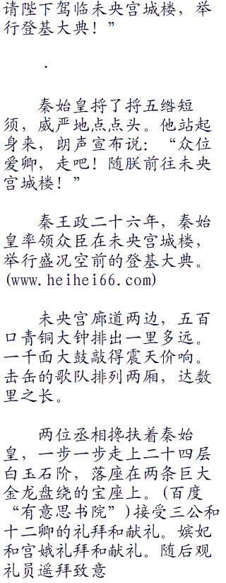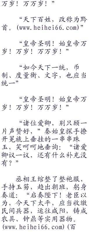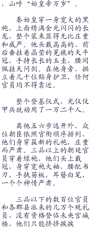 “废除‘孤家’、‘寡人’这些陈旧称谓,皇帝自称‘朕’,以示至高无上、至尊无比,别的任何人不得僭越。”秦始皇扫了一眼宝座下的朝班,神态威严地朗声下谕:“朕为始皇帝,后世以数计,二世、三世至于万世,朕的江山将传之永世!”