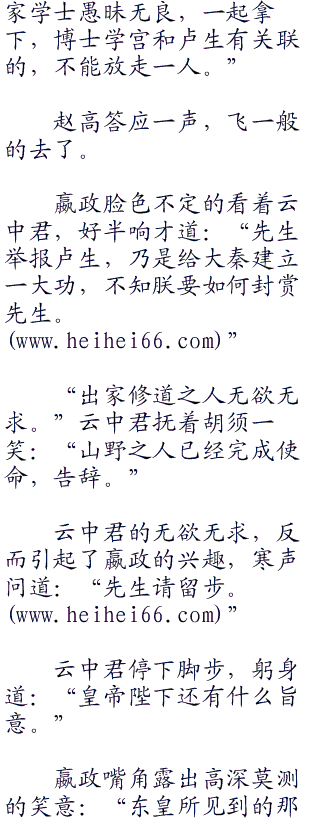 就是心中长满了翠竹,云中君也被嬴政看的长满了毛,这是一种人君睥睨天下的气势,比起江湖高手胜了百倍,咬牙道:“经过东皇大人秘密查访,才知道这个人是鲁国王室的后裔,名叫鲁定文,现在化名卢生,混迹在博士宫中,图谋复辟。”