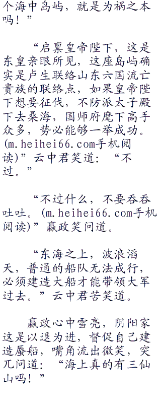 云中君将心一横:“卢生国亡之后,混迹在桑海,东皇得到苍龙七宿的示警,这才走下九宫神都山,追寻卢生的足迹,在距离桑海的一座岛屿之上,才发现上面修建了一座颇具气象的宫殿,名叫鲁宫,宫中时常有人出没,东皇隐身其中,竟然发现了这是一个规模颇大的聚会,负责主持的正是卢生。