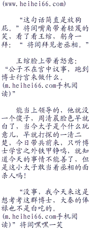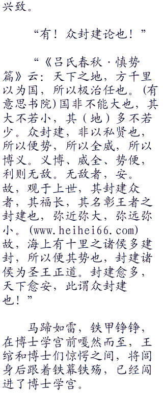 王绾心怀打开,端着酒樽和博士们连饮三爵,这才道:”老夫今天来博士学宫,一是替陛下感谢博士们为国谋思,让大秦朝堂一改往日的粗鄙,创制有功。第二,是想和博士们商议新朝制式之根本,诸位都是游历七国,治世之能臣,还望畅所欲言。”