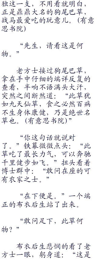 “嗤”将闾一口就将刚喝进嘴里的兰陵美酒喷了出来,如果铁殇拿出任何一支谷草,将闾都可能不认得,但是唯