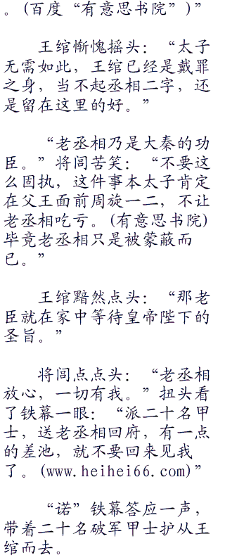 将闾回头看了一眼王绾,黯然一叹,不管王绾有多大的功劳,丞相的位置已经保不住了,只希望父王能听在即的话,留下他的爵位,让他荣归故里颐养天年,忍住心中的悲切:“老丞相放心,这件事小子一定会在父王面前进言。”