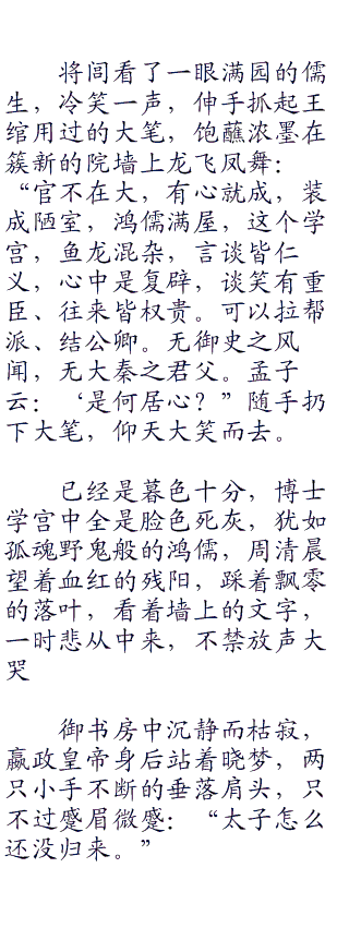 从来就没想过,一手筹建的博士学宫,竟然隐藏着这么大的阴谋,而一群博士已经瘫倒在地,老泪横流,如果不是铁幕铁殇两个镇殿将军在,咬死侯生的心都有了。