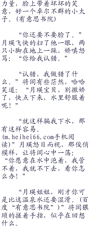 “哗啦”一声水响,将闾从袅袅的水汽中冒出头来,随手抹去头上的水珠儿,脸上笑的阳光灿烂,这一阵时间,就没放松一刻,一直绷紧的心情在水中畅游一番随即轻松下来。笑着向瑶姬招招手:“老婆。快来,这水真的不错。”