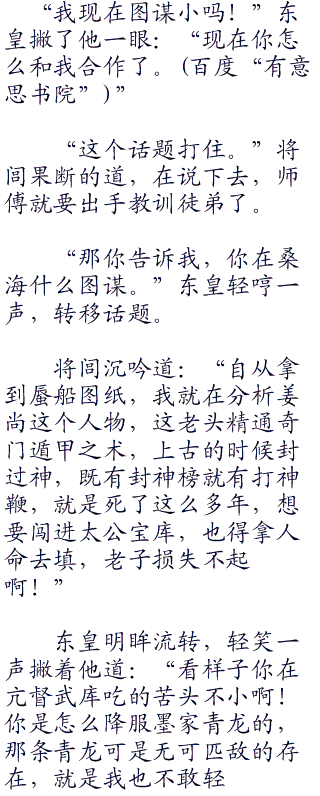 东皇娇俏的白了他一眼:“你还想让我怎么样,处心积虑的对付阴阳家,我没找你算账就不错了。”