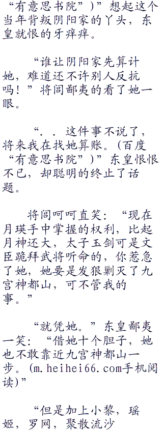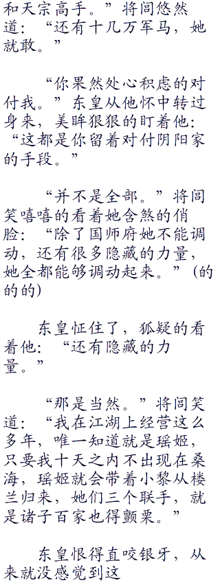 “哼”东皇脸色稍缓,顺势偎依在他怀中,仰着俏脸看着他:“她想做什么。”