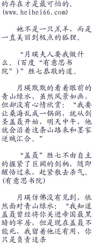 “胜七先生,你吓坏我了。”月瑛拍拍高,耸的玉山,顿时一阵起伏跌宕。