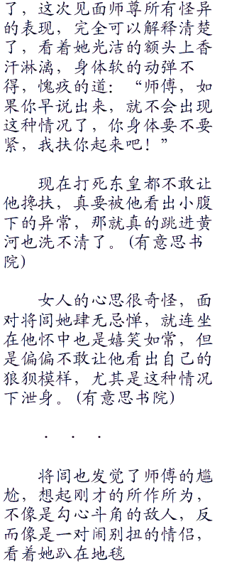东皇只觉得身体酸麻,快意难当,服下似乎有丝丝缕缕的蜜汁分泌出来,生怕将闾察觉,急忙挣脱了他的大手,伏在地毯上娇喘吁吁,惊恐叫道:“不许在碰我。”