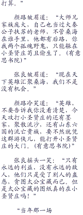 将闾轻轻摇头,就听“吱呀”微响殿门开了条缝隙,外面有人低声道:“殿里好像没人,咱们先在这儿躲一躲。”说话间,两个人走了进来,却是张良和颜路。