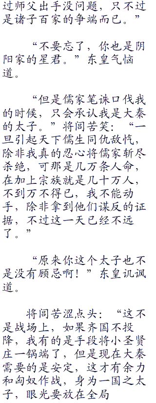 庙堂上的思维东皇永远不懂,但是她却很清楚。这个混蛋徒儿算计了天下人,不管是墨家,儒家,阴阳家还是聚散流沙,就连流浪在江湖上的游侠儿,也全都被他当了枪使。