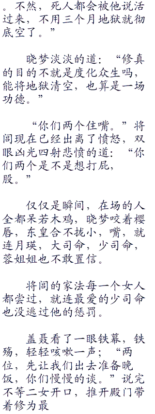 对于晓梦的指责,东皇嗤之以鼻:“不要拿天宗那种悲天悯人的教条约束我,就连你也是视生命如草芥,反正本姑娘也是十恶不赦,在多点罪也无所谓,想打架我奉陪。”