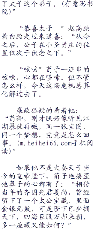 嬴政微微一笑:“朕这次不远万里前来桑海,只是为了这个小子,这小子不学无术最爱胡闹,但却深的朕的喜爱,所以朕想将这小子托付给荀卿管教,不知道荀卿可否给朕分忧。”