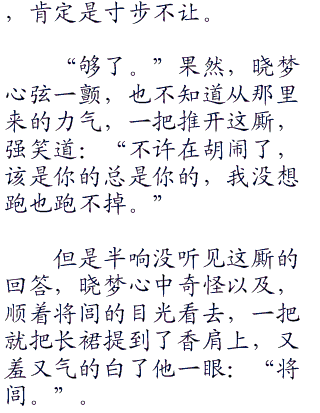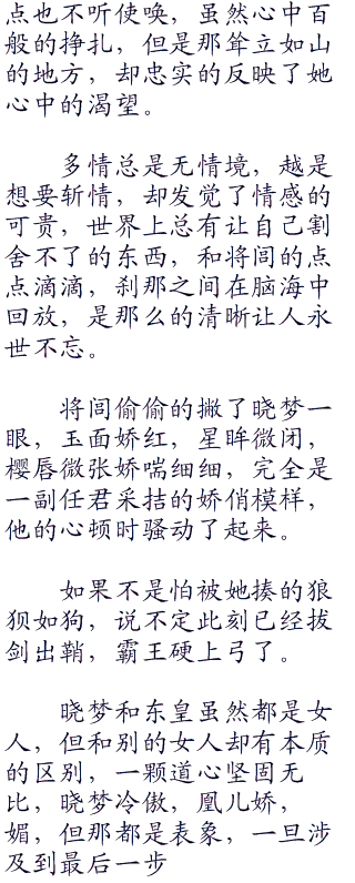 晓梦心中又羞又气,又急又愤。每天呆在将闾身边,看着他和众女打情骂俏,无时无刻不被嫉妒和思念折磨,心中时时刻刻存在将闾的影子,她心中暗自告诫自己,一定要抓住机会,不让凰儿那个狐狸精比下去。