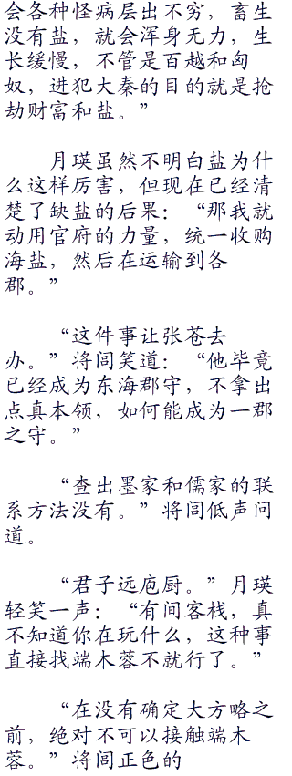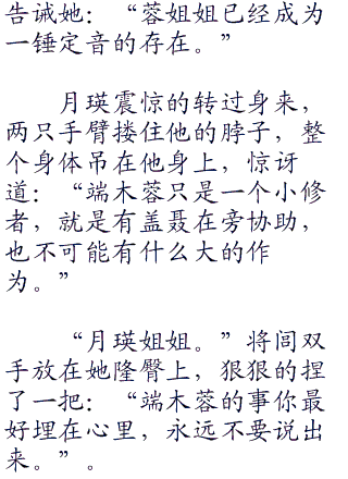 月瑛在云霞阁徘徊了许久,不见将闾出来,咬紧银牙刚想闯进去,就听房门一声轻响,将闾衣冠不整的走了出来。