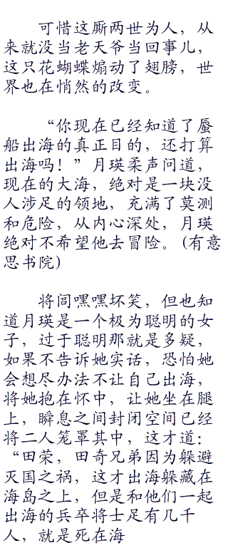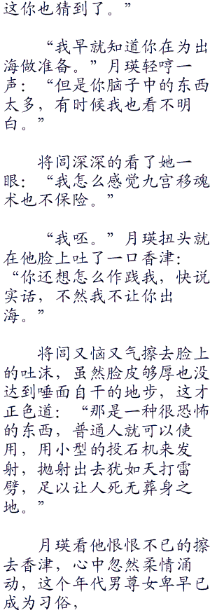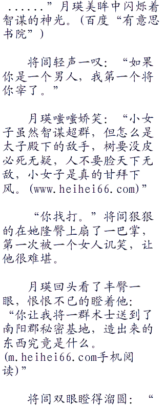 这个年代的人不知道蝉吃的是什么,一直都以为蝉“零零零”餐风饮露,是一种灵兽,所以月瑛才将自己比成一只蝉,将闾这样的说法还是第一次听到。心中虽然惊讶,却懒得在搭理他,却没想到将闾在她耳边低语:“蝉儿吸的是树的汁液,不知道月瑛夫人吸食的是什么。”