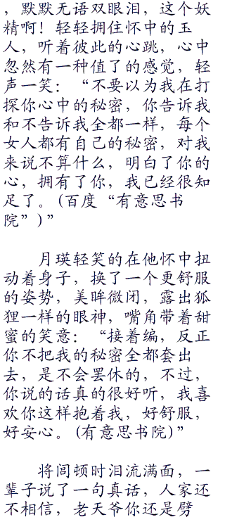 将闾一手抚,摸着她柔顺的长发,一手在她柔美的身体上轻轻移动,月瑛偎依在他怀里,美眸半睁半闭,享受着爱人带给她的温柔。
