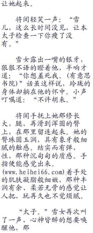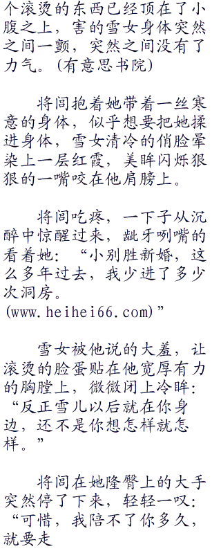 现在将闾却是情,欲难禁,雪女性格清冷,从来就不肯放开和自己亲热,六年的苦熬让一个冰雪神女变成了深闺怨妇,润滑的雪丘顶在身上,愉悦销,魂的感觉传遍身体,一缕细若游丝的呻,吟,仿佛风吹过了箫管似的轻轻地呜咽出来,让将闾一颗心顿时骚动起了。