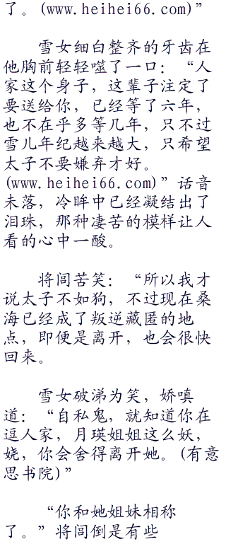 “太子,不要闹了。”雪女冷眸含情,看着他变得成熟起来的俊脸:“这么多年,雪女不在你身边,太子一向可好。”