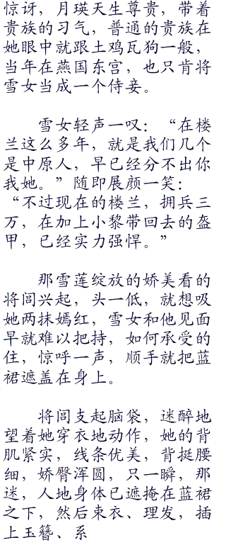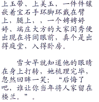 雪女嘴角荡漾着一层笑意:“雪儿不苦,楼兰乃是世外桃源,没有了勾心斗角尔虞我诈,雪儿过的很安心,众人都拿我当姐妹,就是这些年想念太子。”说话之间,声音带着呜咽。