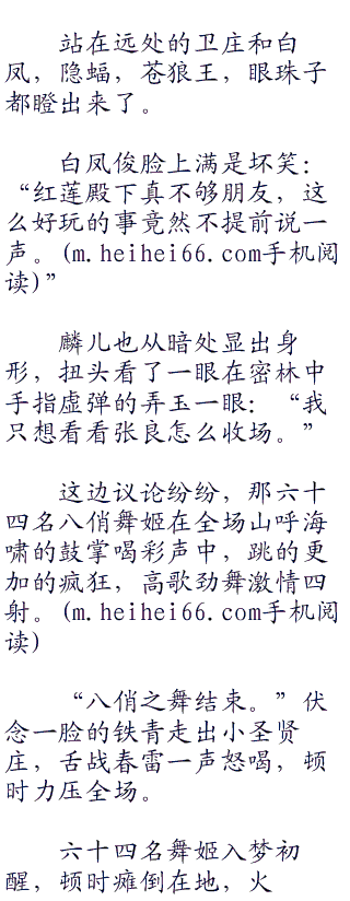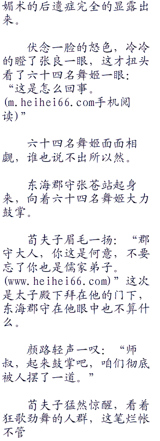 站在门口迎接大秦太子的张良脸都绿了,虽然身在儒家行的是苟且之事,但是机关算尽也没想过会发生这种变化,能够同时控制六十四名舞姬干出这种事儿来的,只有大秦太子无疑,心中暗骂一声卑鄙无耻下流,却没有任何办法阻止高声鬼叫的八俏舞姬。